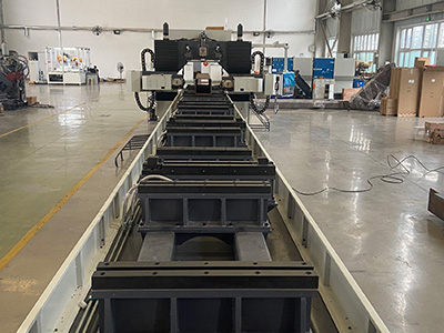 1. The CNC double-end drilling machine is a gantry-type CNC machine tool, consisting of the bed, longitudinal slide table (X-axis slide table), gantry, vertical slide table (upper and lower slide tables), power head assembly, tool magazine, electrical control system, chip removal and cooling system, and automatic lubrication system.